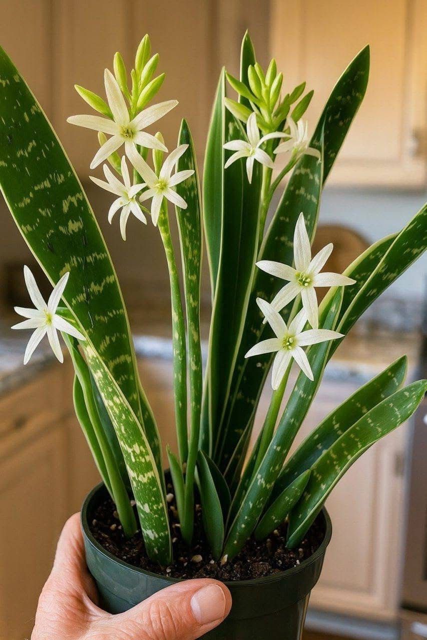 Mother-in-Law’s Tongue (Sansevieria) is a tough, low-maintenance houseplant known for its striking, sword-like leaves and air-purifying qualities. But did you know it can bloom? When conditions are just right, it produces long stalks of tiny white or greenish flowers that smell sweet and jasmine-like, especially at night.