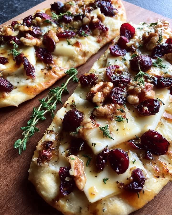 Crispy Flatbread with Brie, Cranberries & Toasted Walnuts with a Maple Syrup Drizzle