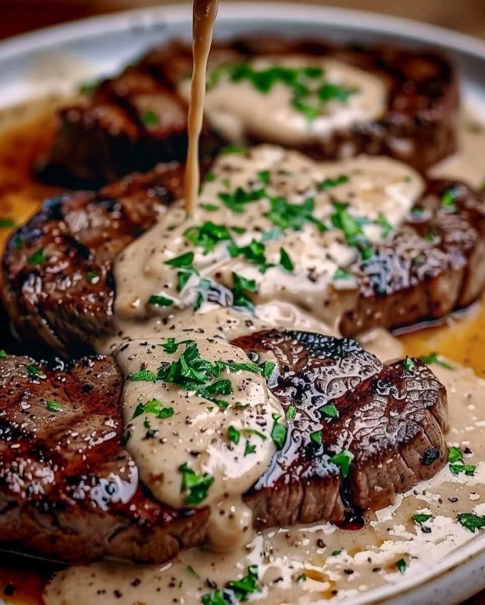 Serve: Drizzle the creamy garlic sauce over the cooked steaks and garnish with fresh parsley. Serve with your favorite sides! Enjoy your delicious steak meal! 🥩🍽️🧄