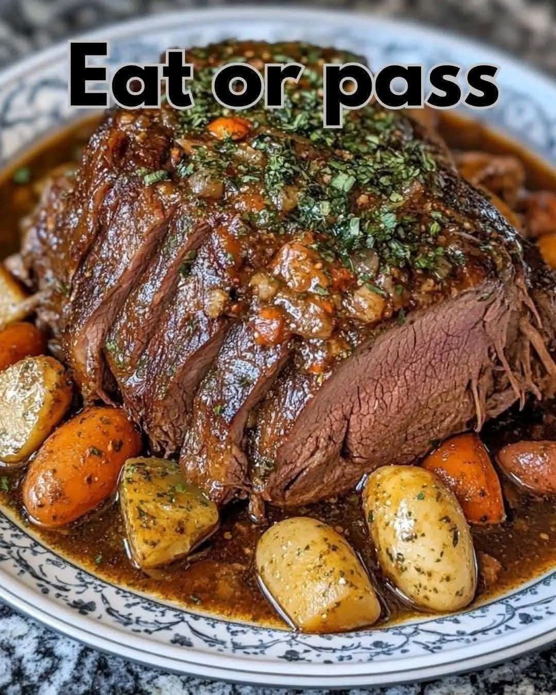Tender chuck roast slow-braised with vegetables in a savory gravy.