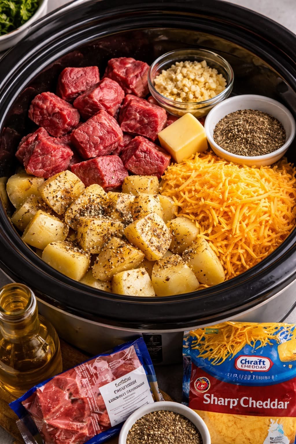 This set-it-and-forget-it crockpot dinner is pure comfort food. Tender steak bites, soft potatoes, and melty sharp cheddar come together in one pot for an easy, hearty meal the whole family loves.